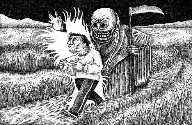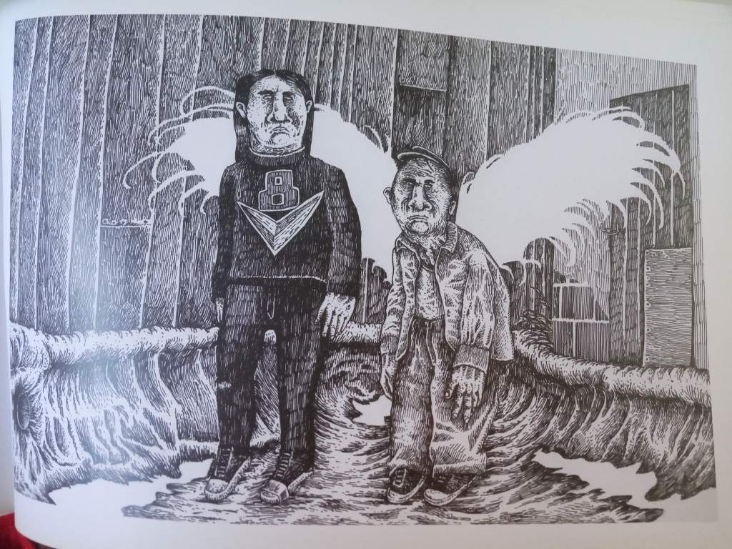 Por lo demás, a la par de la maestría (las luces y las sombras, las posturas corporales, los detalles en las escenas, la organización de los elementos) con la que Nicolás ilustra a los gorilas y los bajoflorenses, hay un rasgo en particular que me gusta en Mono Sacer: la mirada paranoica que sólo puede ver gorilas y bajoflorenses no crea desde la nada sino que toma como modelo obras maestras de la pintura y las resignifica trabajándolas desde el grotesco, cruzándolas con escenarios urbanos o suburbanos y poblándolas con nuevos personajes. De este modo, Nicolás Arispe se apropia de las pinturas de Velázquez, Brueghel y Magritte (entre otros) y sus líneas blancas y negras las actualizan y las vuelven representaciones político-sociales. La cita, en Mono Sacer, es un recurso que retoma el pasado en sus figuras y acontecimientos (el regreso de los “gorilas”; el bombardeo del 55’) pero también en sus obras de arte para iluminar el presente, para dar cuenta de una perspectiva que reordena lo visible, polarizándolo y volviéndolo grotesco…»