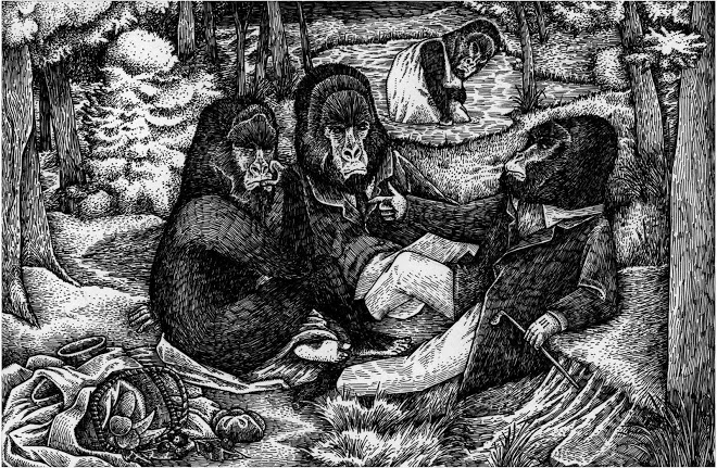 En la ciudad de Mono Sacer, habitan los gorilas pero también los bajoflorenses, dos clases diferenciadas: unos, animalizados, se vinculan con el ocio burgués (la pintura en “Self made man”; el descanso en la naturaleza en “Desayuno en la hierba”), el dominio de los medios de comunicación (la radio en “Señora llamando a la radio” y “Multimedios”), la historia patriótica (la estatua de prócer en “El héroe”) y las instituciones (el aula en “Esto no es una pipa”); los otros, con la cultura popular (la figura de San La Muerte en “Invocación preventiva a San La Muerte”, el disfraz y la preparación en “El carnaval”), con la comunidad (el festejo de “El banquete nupcial” y de “Los fuegos de San Juan o día de todos los muertos”) y con la familia (“Hijo y padre”; “Aniversario ancestral más allá-más acá”). Las diferencias en la caracterización de los personajes es clara: los gorilas presentan un rictus imperturbable, con la excepción de los momentos en que gritan con furia (Nicolás tiene el acierto de recrear algunas escenas típicas de nuestra vida socia-cultural en la que la ideología reaccionaria estalla: la señora-gorila que protesta con la radio y su contrapunto, los locutores-gorilas gritando en el estudio radial; los niños-gorilas que reproducen el bombardeo a Plaza de Mayo del 55’ y que disfrutan de la muerte de sus juguetes), y sus rostros son casi idénticos (y si no, miren “La marcha”, sin carteles, sin consignas, sin expresiones: la forma de diferenciarlos es a través de la vestimenta y de sus pechos). Los bajoflorenses, en cambio, presentan expresiones que van de la alegría a la tristeza (de la familia a los antepasados muertos) y, si bien comparten rasgos (las narices prominentes y los ojos pequeños), sus caras son diferenciables al igual que sus vestimentas.